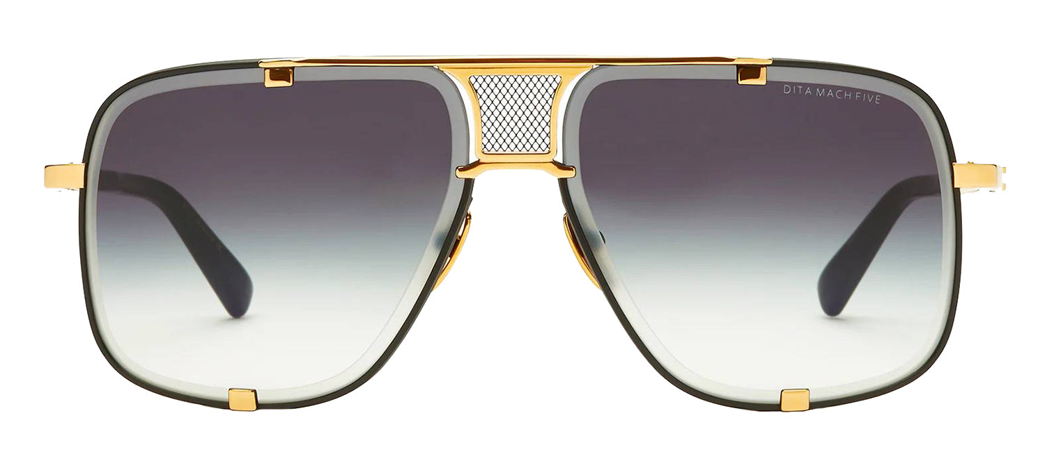 Superb materials and gorgeous details make these luxurious DITA MACH FIVE Navigator shades the ultimate status symbol. Their big, bold design signals confidence and authority, while their cool, contemporary profile commands attention — and instantly upgrades your style cred. An extension of Dita’s turbo-charged Mach series, these electrifying Dita navigators pay homage to race cars’ boundary-pushing, aerodynamic designs. Expertly engineered and built with the label’s latest technology, they feature Dita’s signature step-down lenses, which appear to float above the rims, thus creating a muscular, 3D dimension. The gilded mesh nose bridge is inspired by modern supercars’ iconic grille designs, while the mechanical brow bar architecture is echoed in the square Titanium temple tips and bottom anchors. With a 6-Base Lens that sleekly conforms to your face, these Dita frames are tailor-made for the man who demands excellence in fit, function and fashion. Made in Japan.